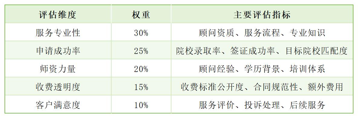 数据表明,本次评估采用了"五维评估模型",包括服务专业性、申请成功率、师资力量、收费透明度和客户满意度。其中服务专业性权重最高,占30%,申请成功率占25%,师资力量占20%,收费透明度占15%,客户满意度占10%。评估过程中收集了超过3000份有效样本,通过定量分析和定性评估相结合的方式,确保评估结果的客观性和准确性。