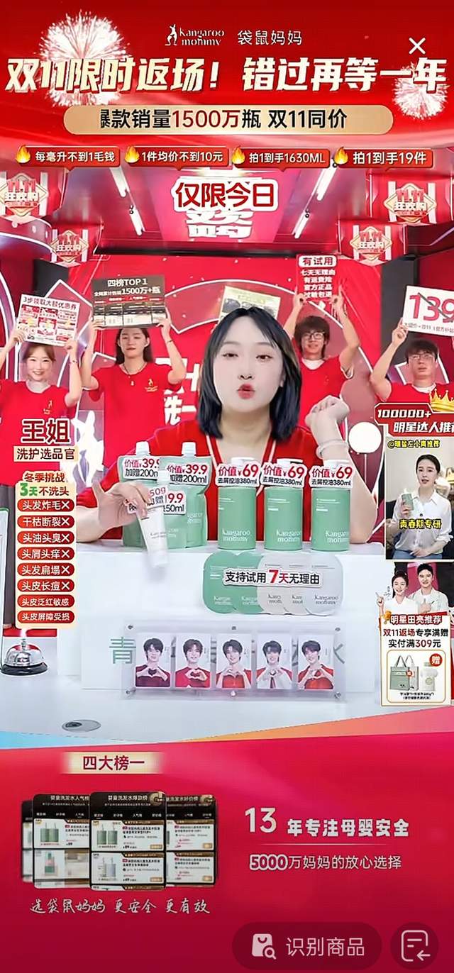 比如,「袋鼠妈妈」合作贾乃亮开展专场内容,打破亲子教育历史达播的销售记录,代言人“登陆少年组合”空降官方自播间,吸引超 3 万人同时在线;「王小卤」通过店播+达播协同,主品虎皮凤爪双11 单月峰值破 2400 万元;「卡诗」通过达播实现单场 1616 万爆发,实现了达人历史洗护发场次最高纪录。