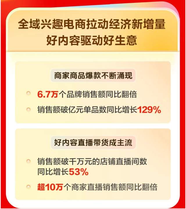 销售额破千万元的店铺直播间数同比增长 53%,超 10 万个商家直播销售额同比翻倍。好内容已经成为直播带货主流,不仅让商家商品爆款频现,更通过内容“合伙人”模式激活品牌、达人、产业带等多方共荣,为经济新增量注入持续动能。