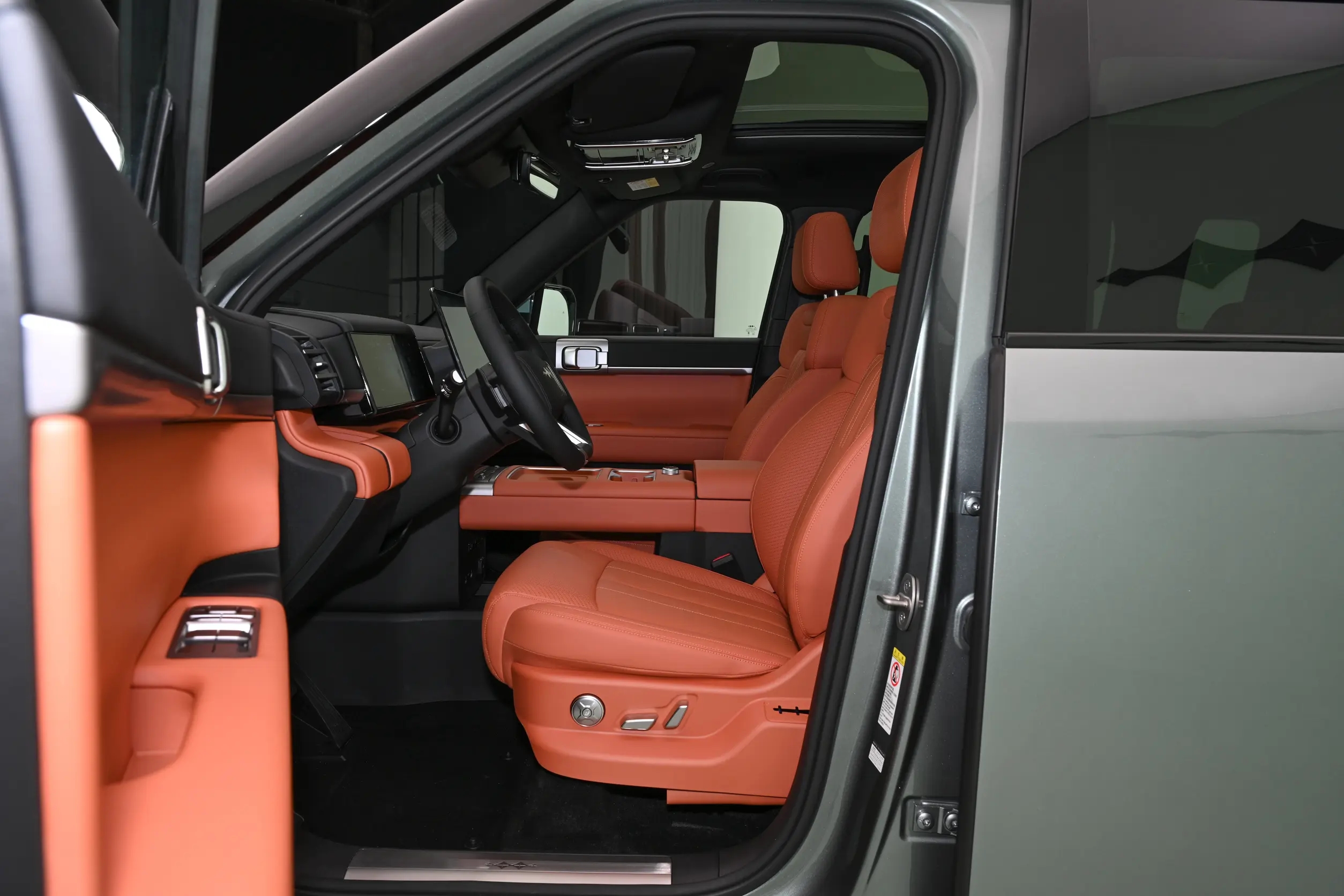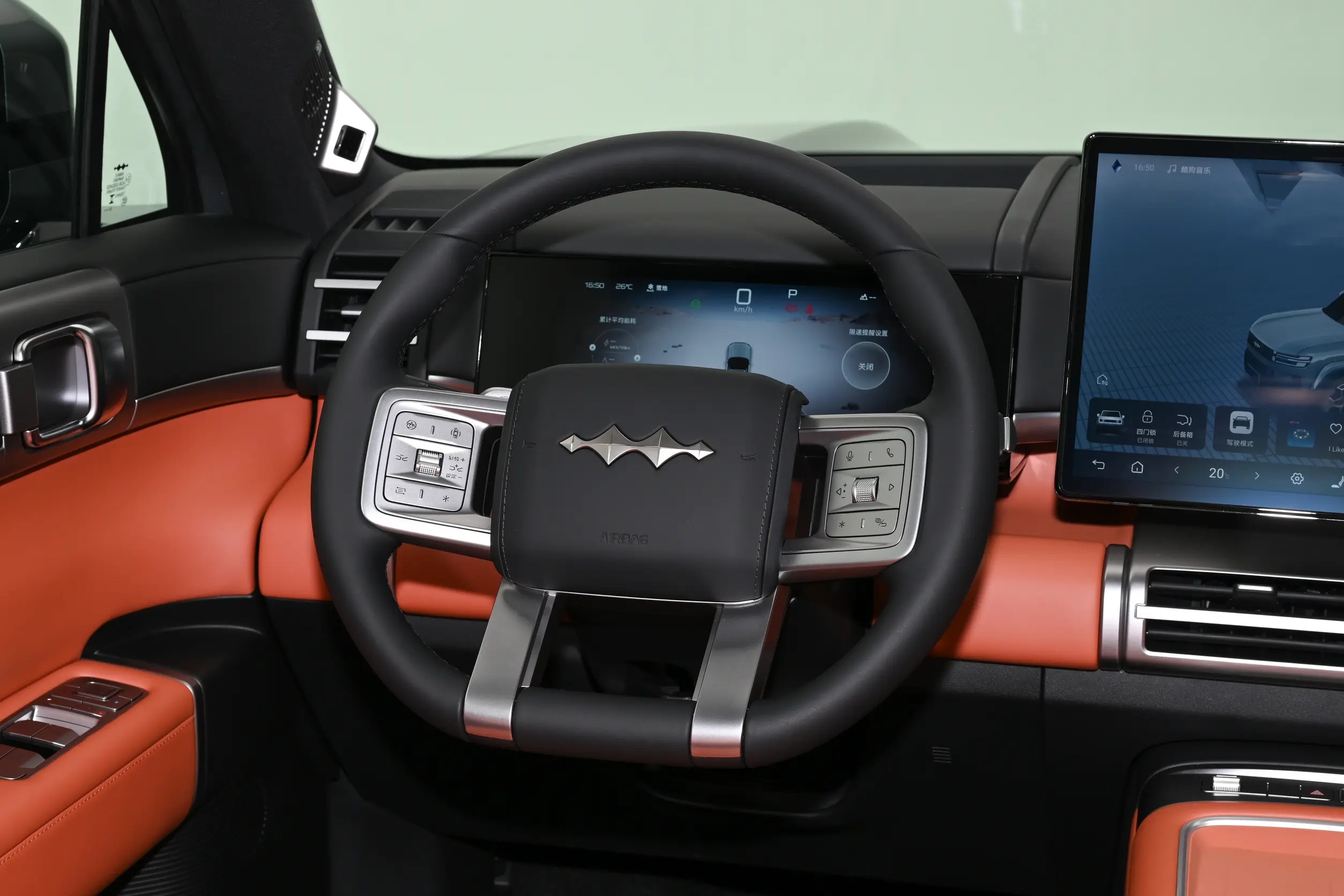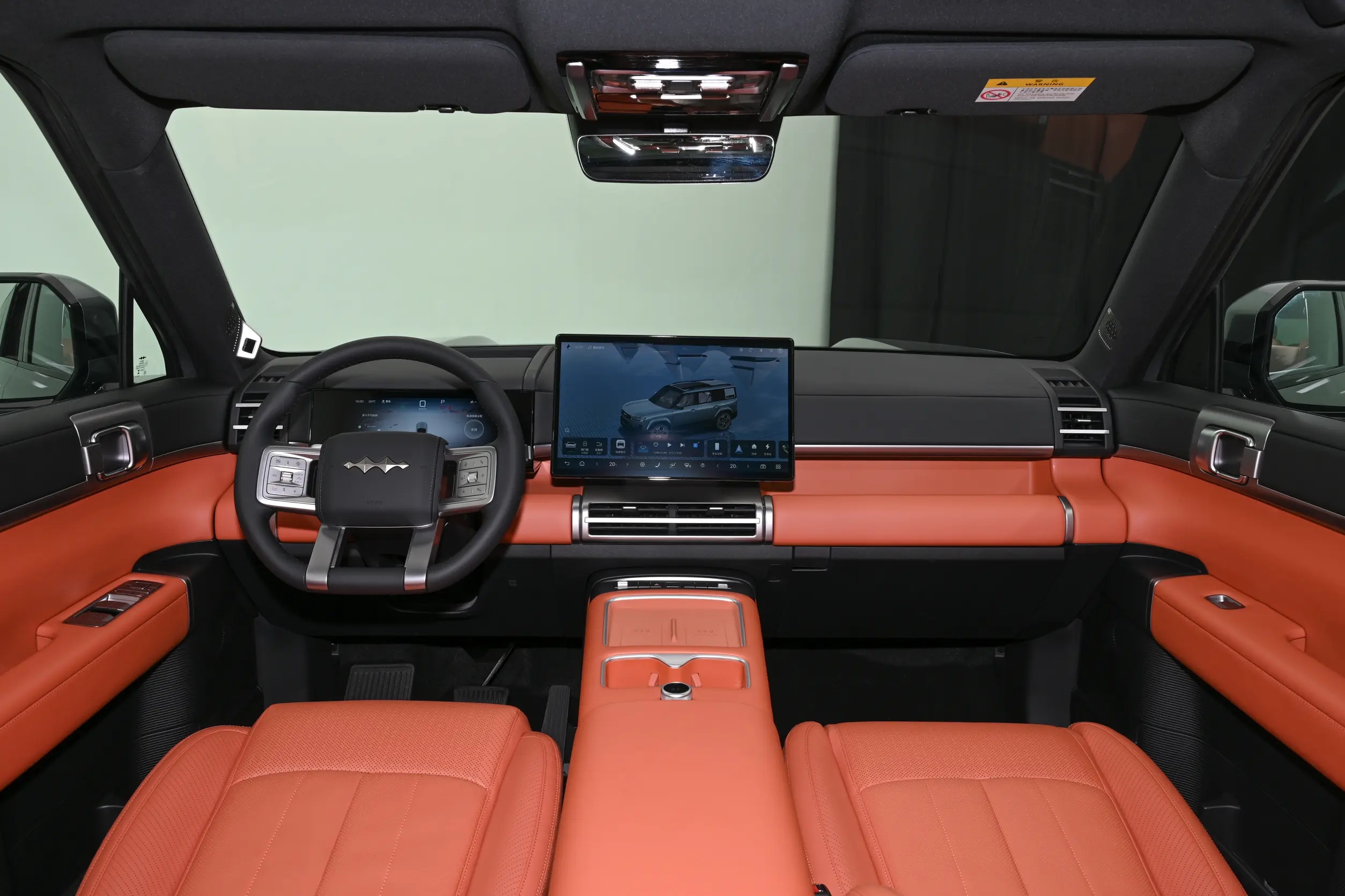 首先我们来唠唠外观,钛7采用的是方程豹家族式的“方盒子”的设计语言,看到这台车的第一眼不仅让我想到了路虎,干净利落的线条和霸气十足的车身确实很吸引人。而且该车还有多种配色可选,保守一点的话我觉得还是首选曜石黑,沉稳又不失大气,行驶在路上就像一道靓丽的风景线。而且,采用的是高强度的笼式车身,超强度钢超过了70%,热成型钢也在19%以上,稳定性和操控性能都很不错,即便是遇到碰撞事件也能够很好的保护车内乘员,安全性还是有所保障的。