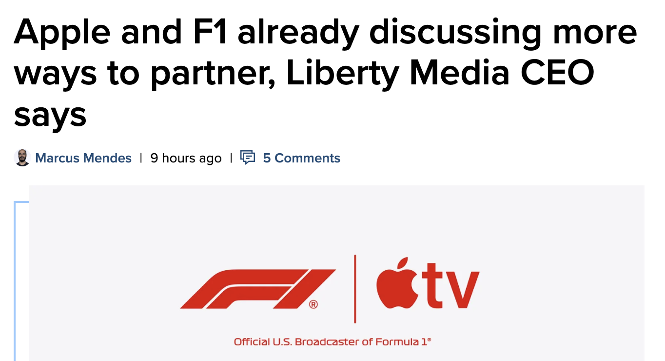 【环球网科技综合报道】11月21日消息,科技媒体9to5Mac报道称,自由媒体集团(Liberty Media)首席执行官德里克·张(Derek Chang)在公开场合透露,苹果公司与一级方程式赛车(F1)的合作关系正迈向全新阶段。双方在苹果已获得F1未来五年美国独家流媒体转播权的基础上,正积极探讨扩展至更多领域的合作模式,苹果也将在体育赛事领域的战略布局进一步升级。