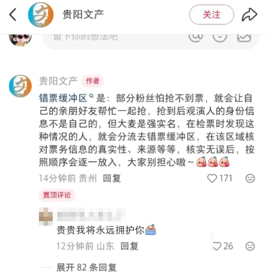 小红书账号“贵阳文产”在一条笔记的评论区中写道:“错票缓冲区是部分粉丝怕抢不到票,就会让自己的亲朋好友帮忙一起抢,抢到后观演人的身份证信息不是自己的,但大麦是强实名,在检票时发现这种情况的人,就会分流去错票缓冲区,在该区域核对票务信息的真实性、来源等等,核实无误后,按照顺序会逐一放入,大家别担心嗷~”这条评论引发争议,目前该评论已不可见。
