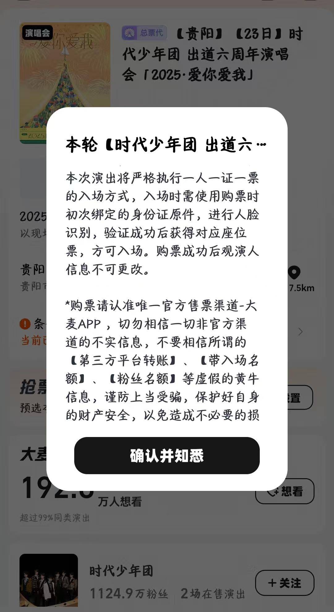 何谓演唱会“错票”?众所周知,当前国内的大型演唱会绝大多数采用了强实名制,也就是一人一证,人证合一才可以进场。时代少年团的这场演唱会也不例外,这场演唱会的总票代大麦网以相当醒目的弹窗告知观众要实名制购票和入场:“本次演出将严格执行一人一证一票的入场方式,入场时需使用购票时初次绑定的身份证原件,进行人脸识别,验证成功后获得对应座位票,方可入场。购票成功后观演人信息不可更改。”