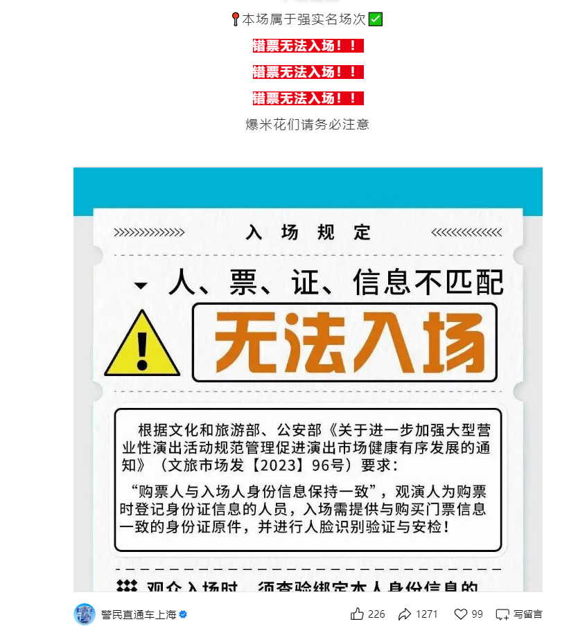 当然,也有的演唱会对错票的态度是绝对不认可,比如今年8月底在上海举行的时代少年团演唱会,上海市公安局在演出开始前发文明确的告知“错票无法入场”,其法律依据为文化和旅游部、公安部《关于进一步加强大型营业性演出活动规范管理促进演出市场健康有序发展的通知》(文旅市场发【2023】96号)要求:“购票人与入场人身份信息保持一致”,观演人为购票时登记身份证信息的人员,入场需提供与购买门票信息一致的身份证原件,并进行人脸识别验证与安检。并提示:“千万不要轻信所谓的错票、邀请函及黄牛兜售的高价票,这都是诈骗的套路。”还提示:“身份证件信息涉及公民隐私、信息及财产安全,公民应正确使用身份证件,切勿冒用、盗用他人身份证件为自己谋利,否则面临的将是法律的制裁。”