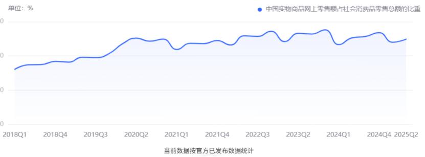 图:实物商品网上零售额占社零比重,来源:中经数据