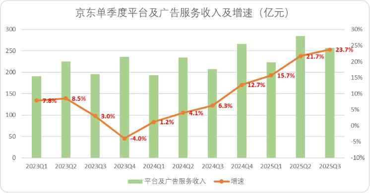 然而,自进军外卖领域以来,在京东各项收入中,唯一未受“国补”政策退坡影响、仍与外卖业务增量保持同步增长的,正是平台与广告服务收入。