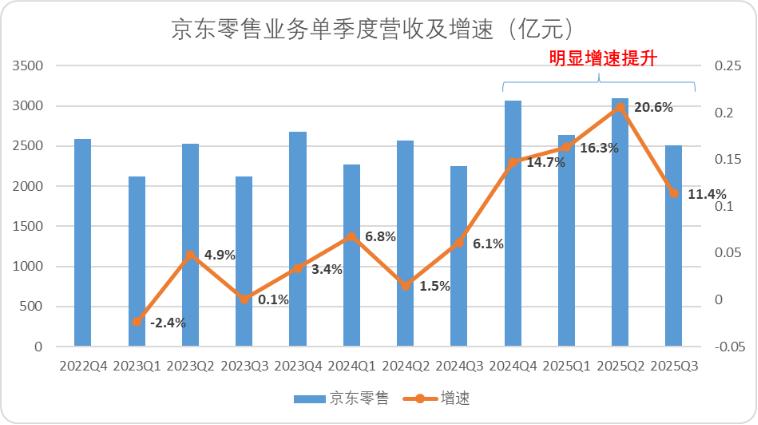 从表面看,京东零售业务今年增速亮眼:前三季度营收增速分别为16.3%、20.6%和11.4%,从过去的低个位数跃升至双位数。