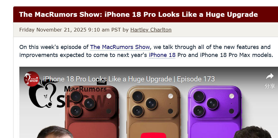 MacRumors指出,iPhone 18 Pro与Pro Max将于2026年秋季与折叠屏iPhone同步亮相,iPhone 18e、标准版及iPhone Air 2则顺延至2027年春季推出。(旺旺)