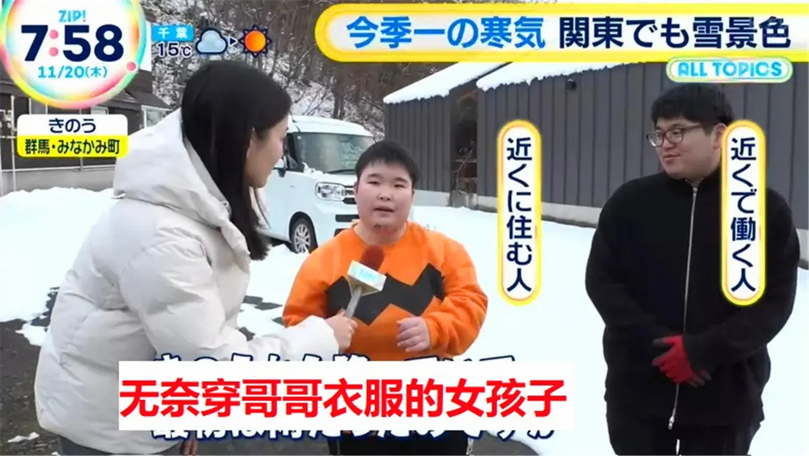 呃,一般来说,在非Cosplay场合,我们很难看见ACG角色出现在现实中。文首骑自行车的老哥也就是远看像《航海王》库赞,近看估计就没感觉了,而“ZIP!”记者采访的这位不但穿的衣服和《哆啦A梦》胖虎一模一样,就连身材和长相也如出一辙,简直像是从动漫中直接走出来的一样!这孩子表示:她11月在当地从来没见过下这么多雪。