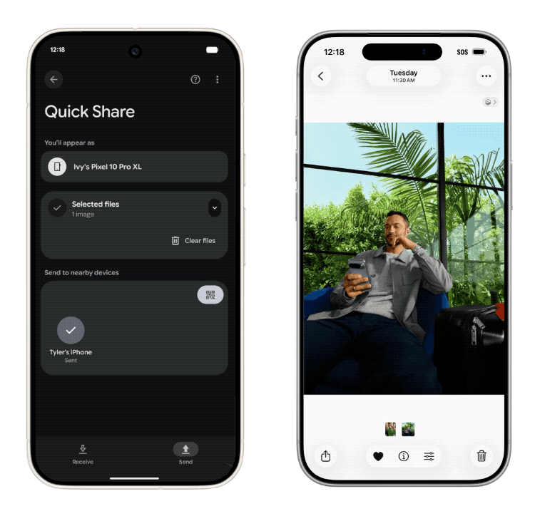 根据谷歌的演示图,在Pixel 10 Pro上打开Quick Share,同时iPhone打开隔空投送开关后,安卓手机就可以直接把选好的照片隔空投送给iPhone。而iPhone如果要传给Pixel 10 Pro,也只需要像发给其他iPhone一样,在隔空投送里点击被搜到Pixel 10 Pro,就可以直接传过去。