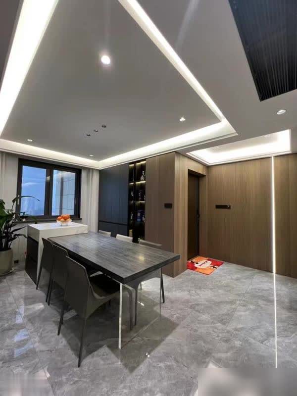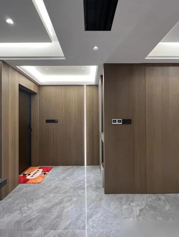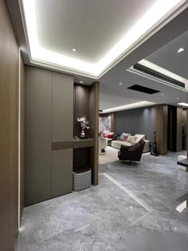 很多人觉得“高级”就得用大理石、水晶灯,可这家人家偏反着来:墙面欧松板打底贴木饰面,留自然缝不做复杂造型;地面亮面地砖通铺,无波导线无门槛石,反光后和墙面灯带一呼应,层高都显高了;无主灯设计更是聪明——不用打扫吊灯,光线均匀不压顶,晚上开着线性灯,整个家像被裹在一层暖雾里。