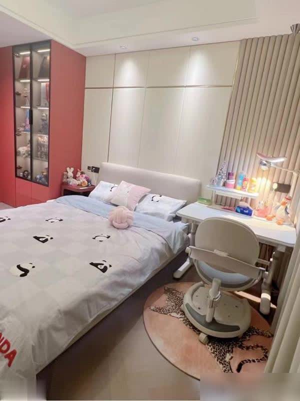 客厅电视墙除了挂电视的位置全做满柜,黑灰配色不单调;玄关嵌入式鞋柜选深咖啡,和木饰面有层次又不跳脱;女儿房衣柜用米灰+红色,奖状、盲盒都能收,连“成长纪念”都考虑到了。