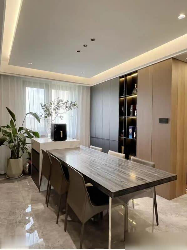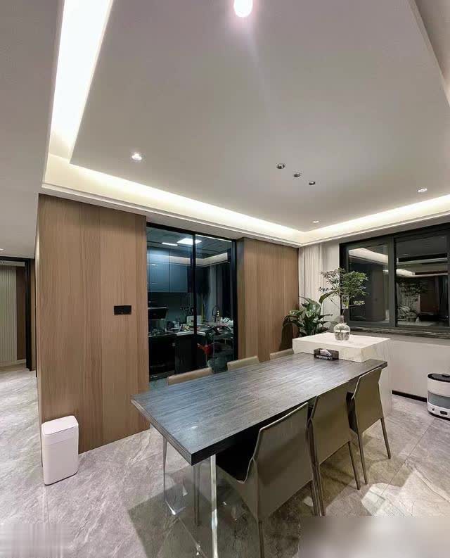 就说餐厅的岛台,既是备菜区又是餐桌延长线,岩板和木纹一冷一暖,晚上灯光一打,端着热汤往这一坐,烟火气和仪式感瞬间拉满。