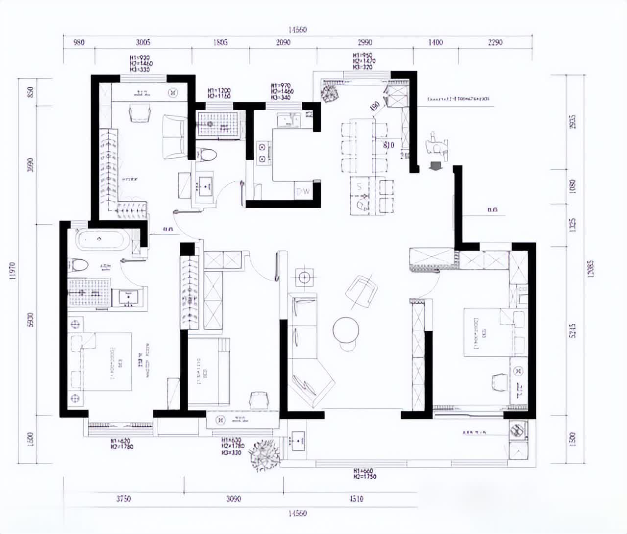 这户人家建面172㎡,套内140㎡,原本是四室两厅三卫的格局,但常住只有一家三口。