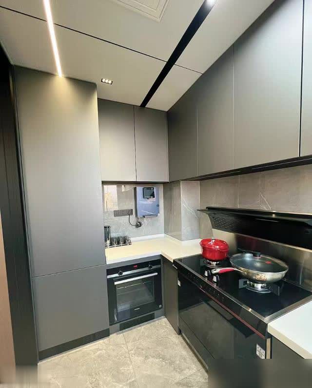 厨房选深灰橱柜+白色台面,隐形把手连磕碰都考虑到了,哪像传统装修里“中看不中用”的花架子?