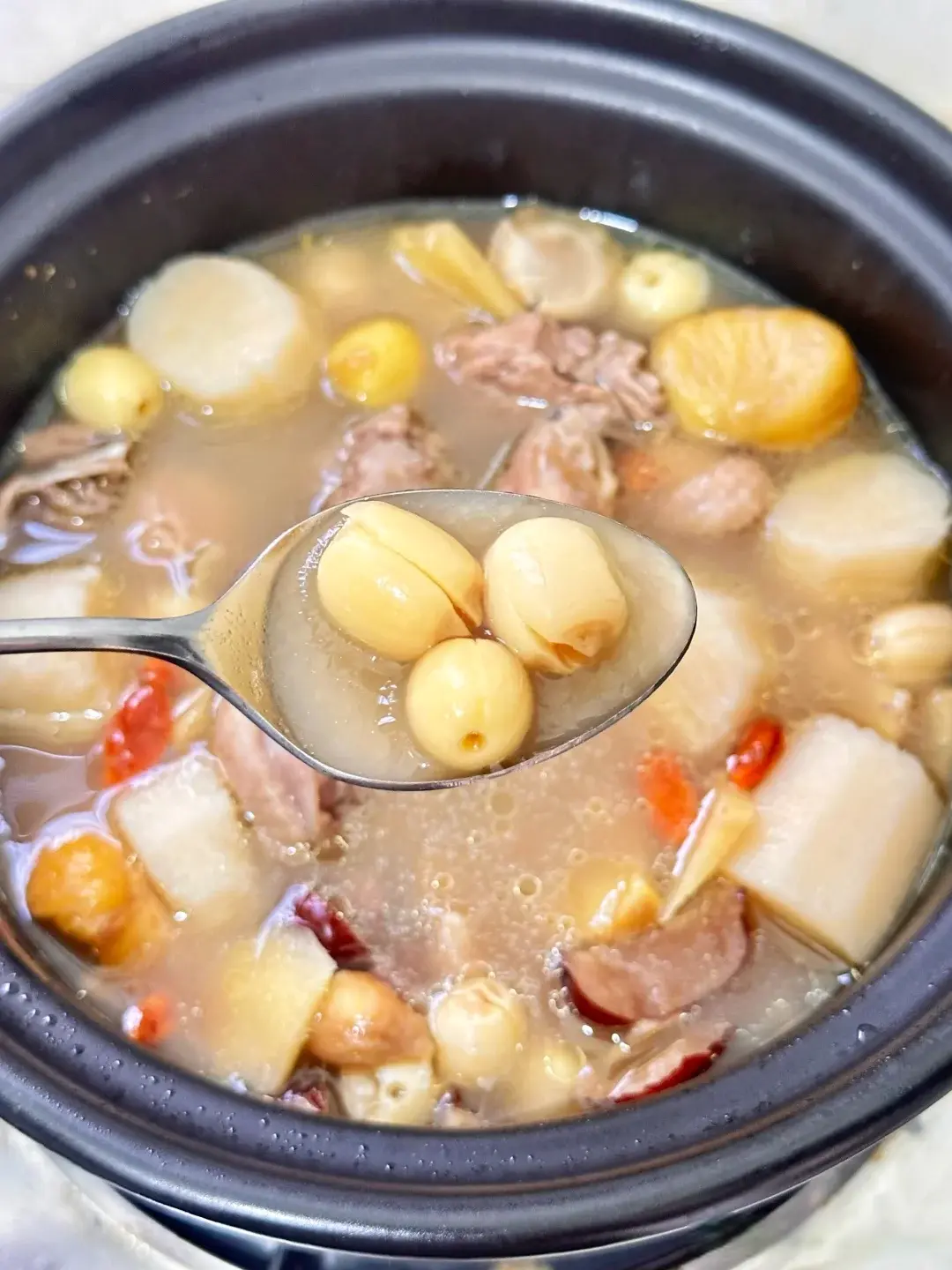 4、开锅后扔几片姜、一小把红枣,小火炖一小时,然后放入板栗、莲子、枸杞,再炖半小时。