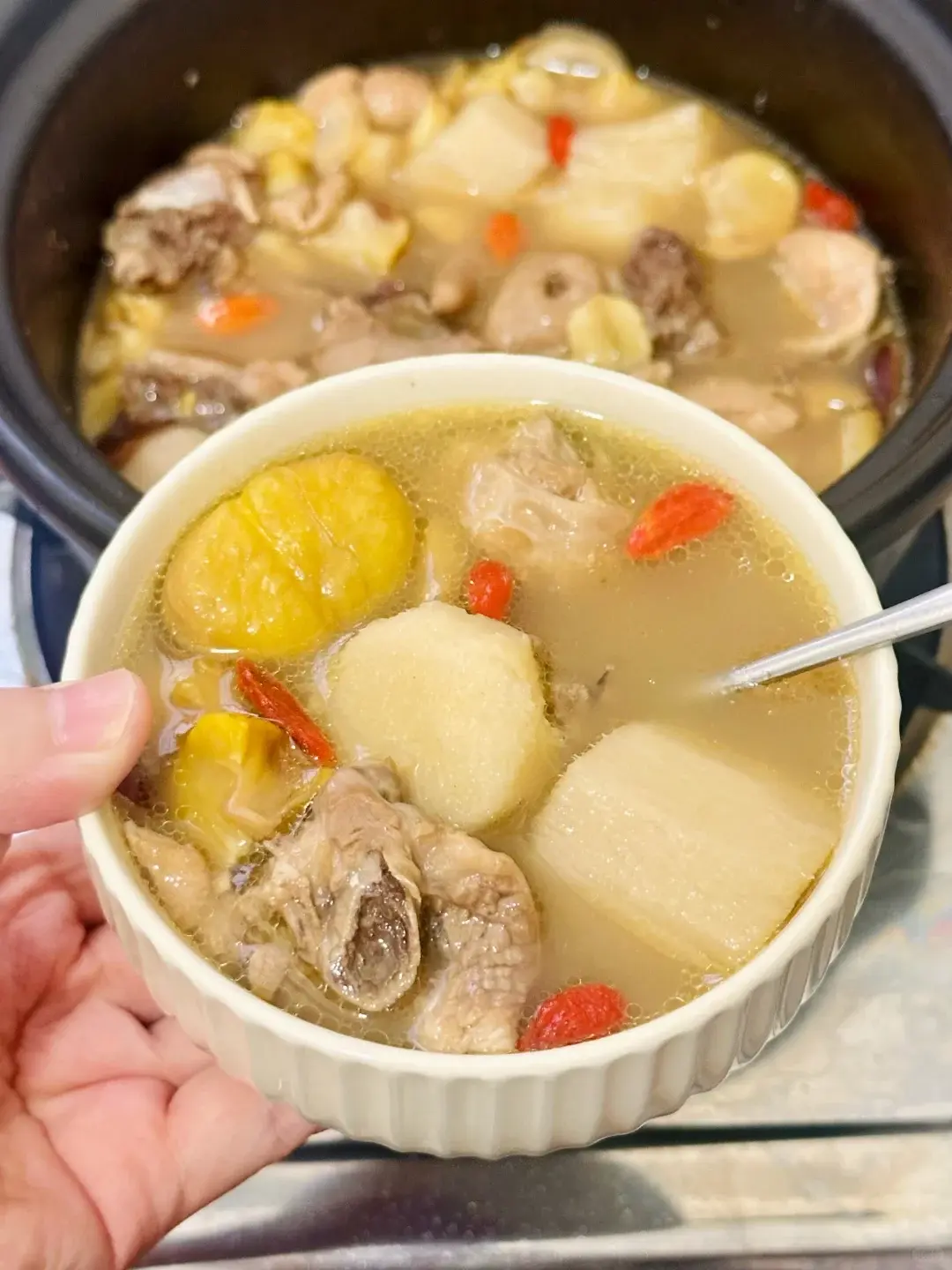 注意: 别提前放盐!盐放早了肉柴汤腥,关火前五分钟撒盐,味道才钻进肉里。汤面上那层黄亮的鸡油别撇,精华全在里头,怕腻就少喝点。