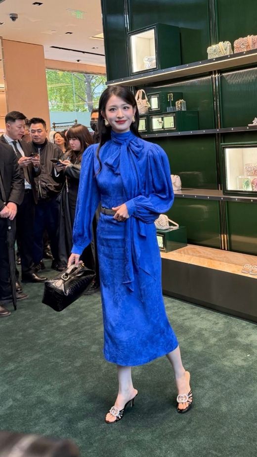 王楚然此次亮相,宛如从童话中走出的冰蓝玫瑰。她身着GUCCI 2026早春宝蓝色提花开叉纱裙,搭配金属腰链与斜刘海长卷发,一出场便吸引了无数目光。冷白皮与冷色调裙装形成强烈视觉冲击,仿佛自带聚光灯效果。露背设计更是大胆又惊艳,在生图中,她的背部线条优美流畅,肌肤细腻光滑,被网友赞“生图如精修”,简直美到犯规。