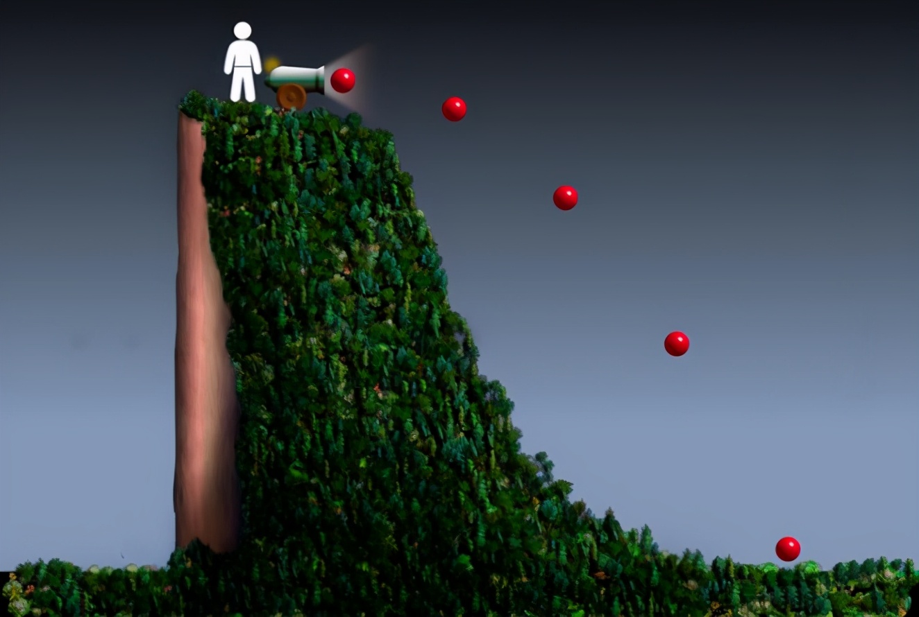假如我们在山顶向着水平方向发射一枚炮弹,接下来,这枚炮弹会因为惯性而具备水平方向的速度,与此同时,它也会在地球引力的作用下向地面坠落,于是这枚炮弹就会飞出一段距离后落到地面上。很明显,炮弹发射时的速度越快,它在空中飞行的距离就越远。