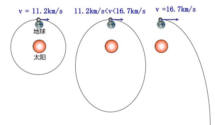 这种速度就是第一宇宙速度,其值约为7.9千米/秒,在此基础上,假如我们继续增加炮弹的发射速度,那么炮弹环绕地球的运行轨道就会变成椭圆形,炮弹的速度越快,这种椭圆形轨道就越狭长,当速度达到11.2千米/秒时,我们发射的炮弹就可以摆脱地球的引力场,进而飞向宇宙深空,这种速度就是第二宇宙速度。
