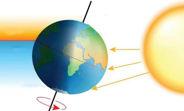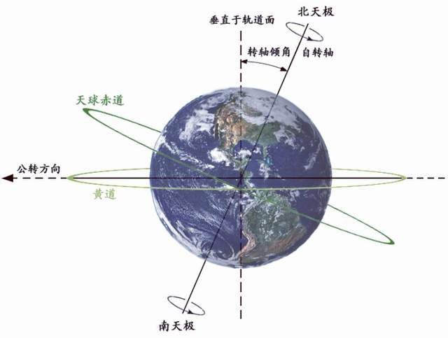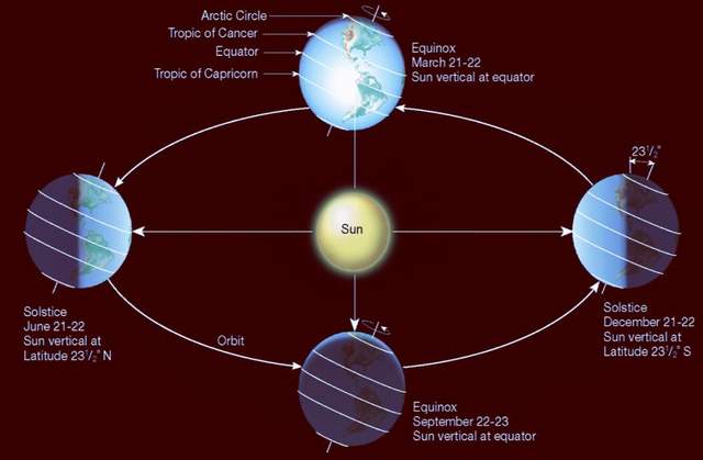 由于地球的自转轴相对于黄道面(即地球公转轨道所在的平面)有一个大约23°26′的轴向倾角,这就导致了地球表面上太阳光的直射区域会随着地球的公转而在南北方向上发生来回移动。