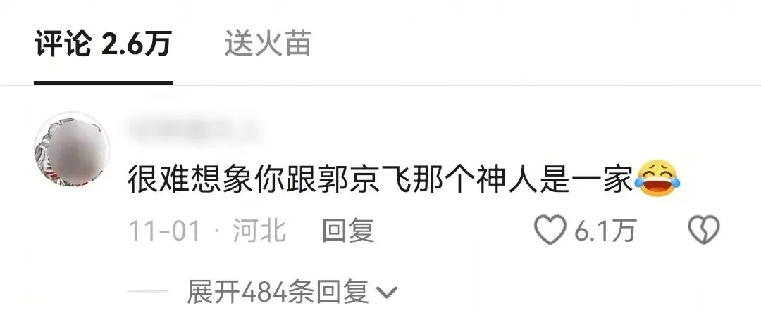 而在评论区,有一条高赞很是搞笑:“很难想象你和郭京飞那个神人是一家。”