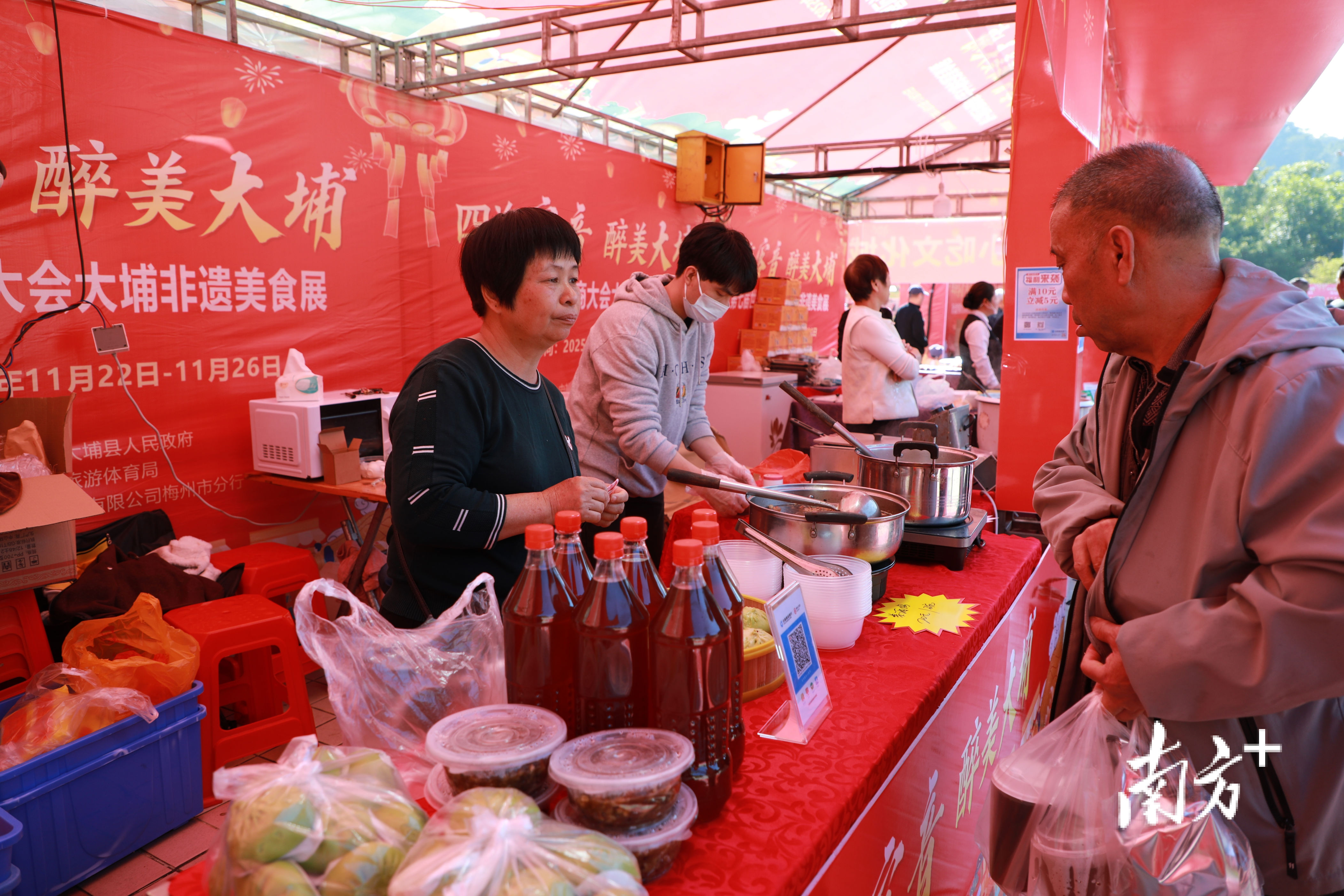 除了斯红羊肉,还有大埔企油饼、客家酿豆腐、梅州腌面、高山云雾茶等数十种非遗美食与特色农产品整齐陈列,吸引着嘉宾们纷纷驻足品尝。