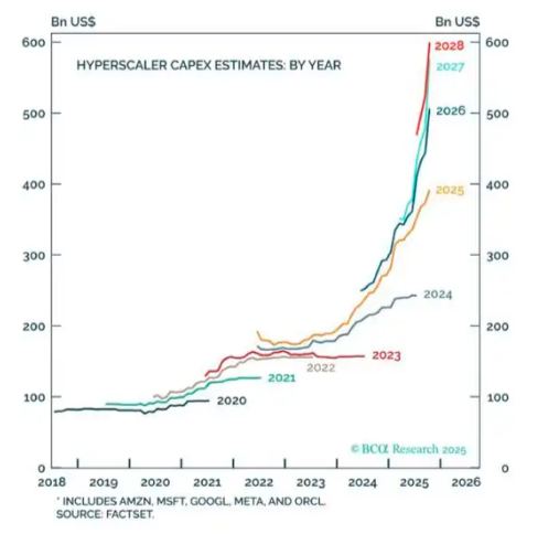 BCA Research全球首席策略师Peter Berezin上周四在领英也发文称:“为何股价下跌?因为若认真看待图表数据,到2030年,超大规模AI公司(hyperscalers)将持有至少2.5万亿美元的AI资产……按20%折旧率计算,每年将产生5000亿美元折旧支出,这已超过它们2025年利润总额。”