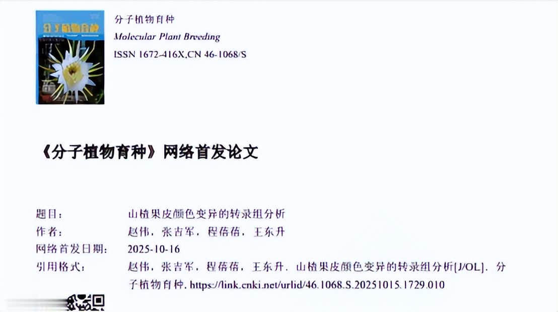 [1] 赵伟,张吉军,程蓓蓓,王东升.山楂果皮颜色变异的转录组分析[J/OL].分 子植物育种.2025-10-16