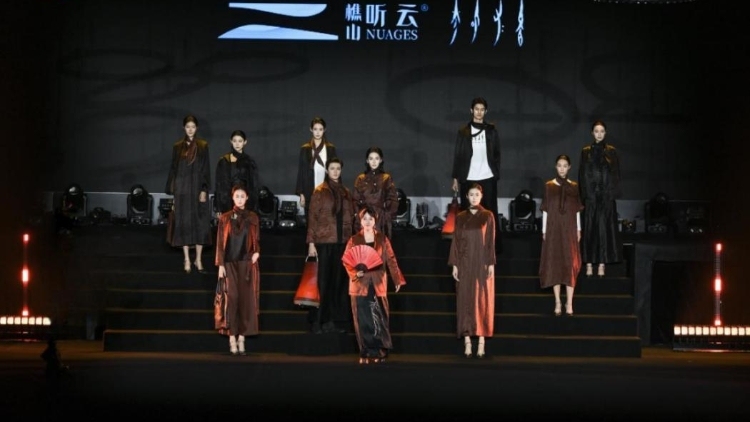 西樵“樵山听云Nuages”品牌亮相非遗香云纱主题开幕秀。