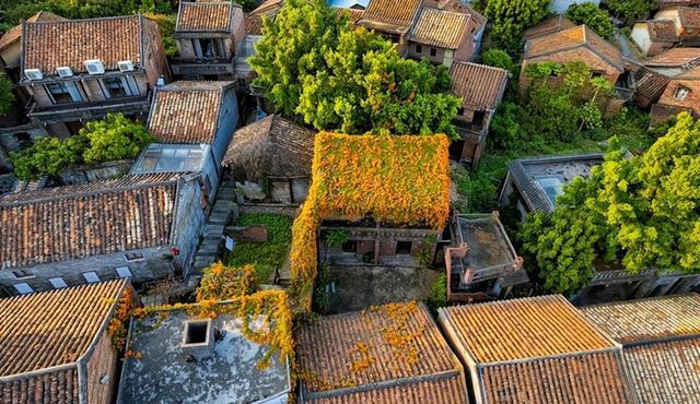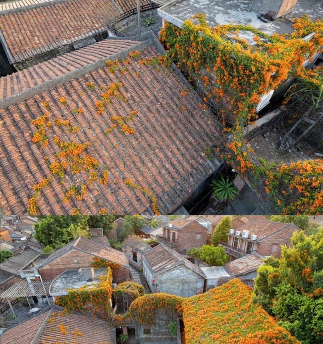 广东一所破旧老房子,整个房顶被花铺满,太美了