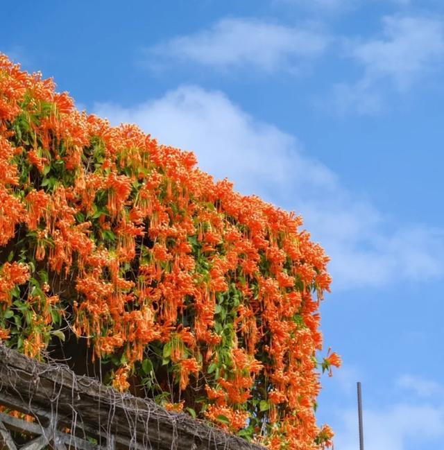 炮仗花这种植物多实在啊,给点阳光和土就能疯长,两三年爬满墙,连老砖破瓦都活过来了。