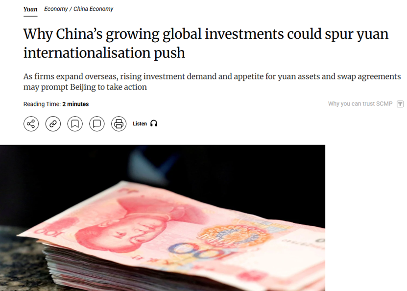 《南华早报》近日发文称,中国日益增长的全球投资需求可能推动人民币国际化进程,这促使政府可能采取更多措施来放宽跨境资本流动,如加快人民币国际化措施、保持汇率稳定和扩大货币互换协议。
