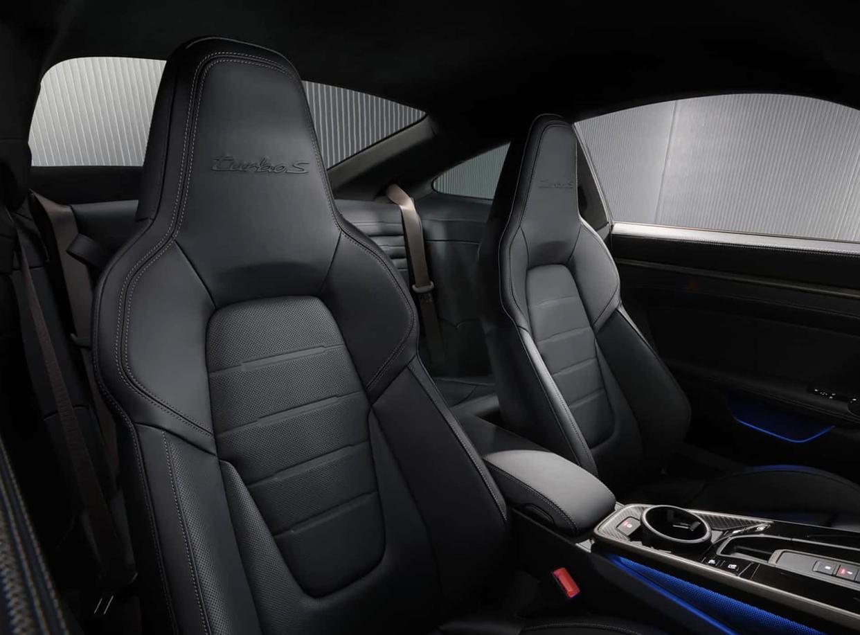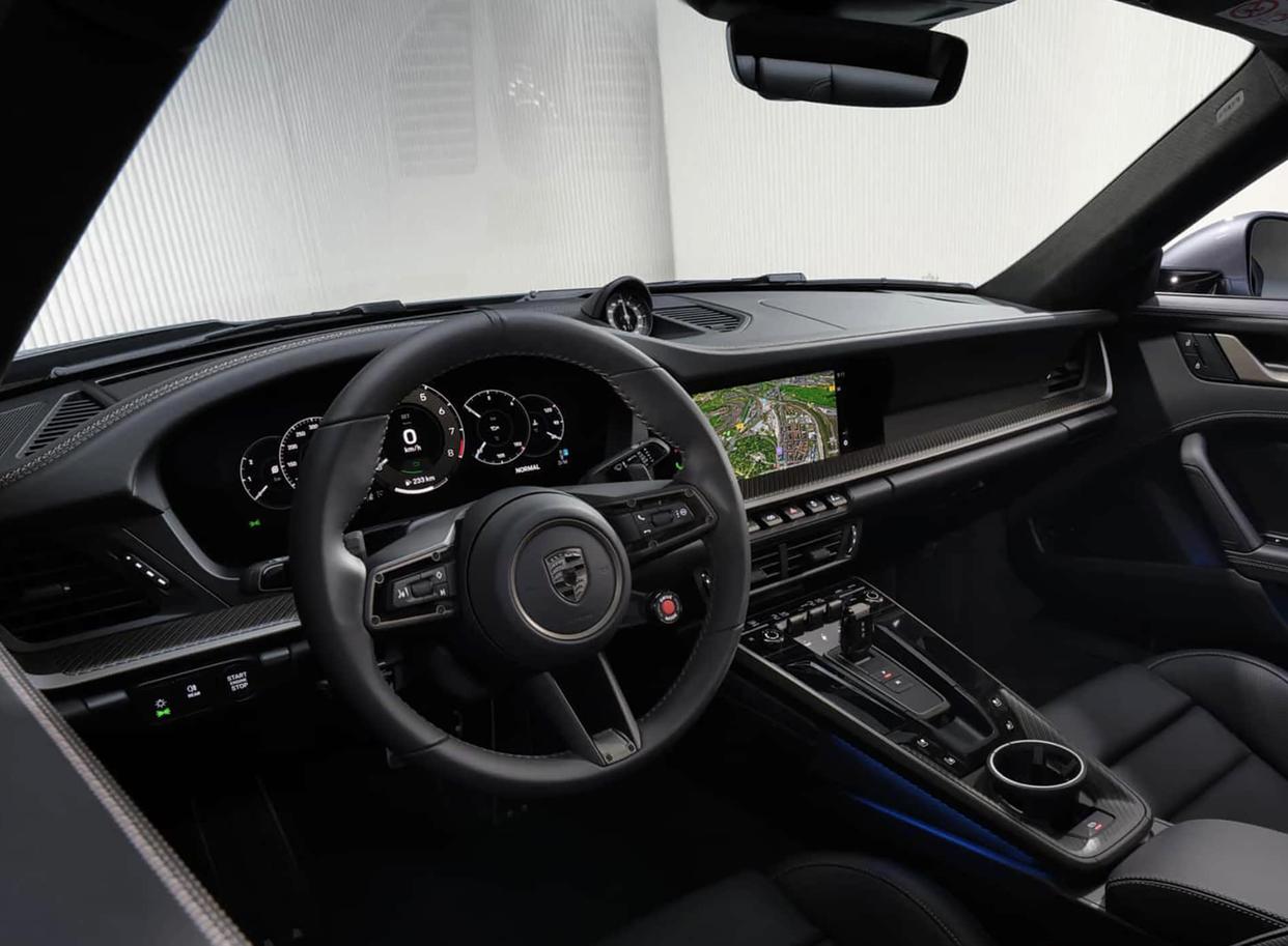 保时捷911 Turbo S的座舱布局保持了经典的设计布局,大面积Alcantara面料的铺陈,再加上碳纤维饰板、亮黑色钢琴烤漆面板以及银色金属材质的点缀,前排还配备了全新的符合人体工学的一体式桶装座椅,体现出“GT”类跑车的舒适感。营造出更加浓郁的赛车氛围。中控台是亘古不变的设计,配备了小尺寸的三辐式多功能方向盘(两侧带有大尺寸换挡拨片),操控岛换成了小尺寸的换挡拨杆,将会带来熟悉的操控体验。科技感方面,该车升级了12.6英寸的曲面全液晶数字仪表盘,同时搭配内嵌式的10.9英寸中控多媒体触控屏幕,其下方还将加入一排物理功能按键,保持应有的机械质感。