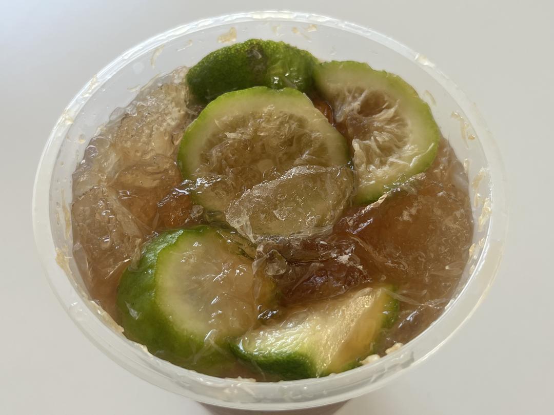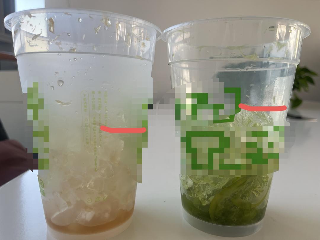 记者购买的两杯柠檬茶,滤掉茶汤之后冰量在图示红线处