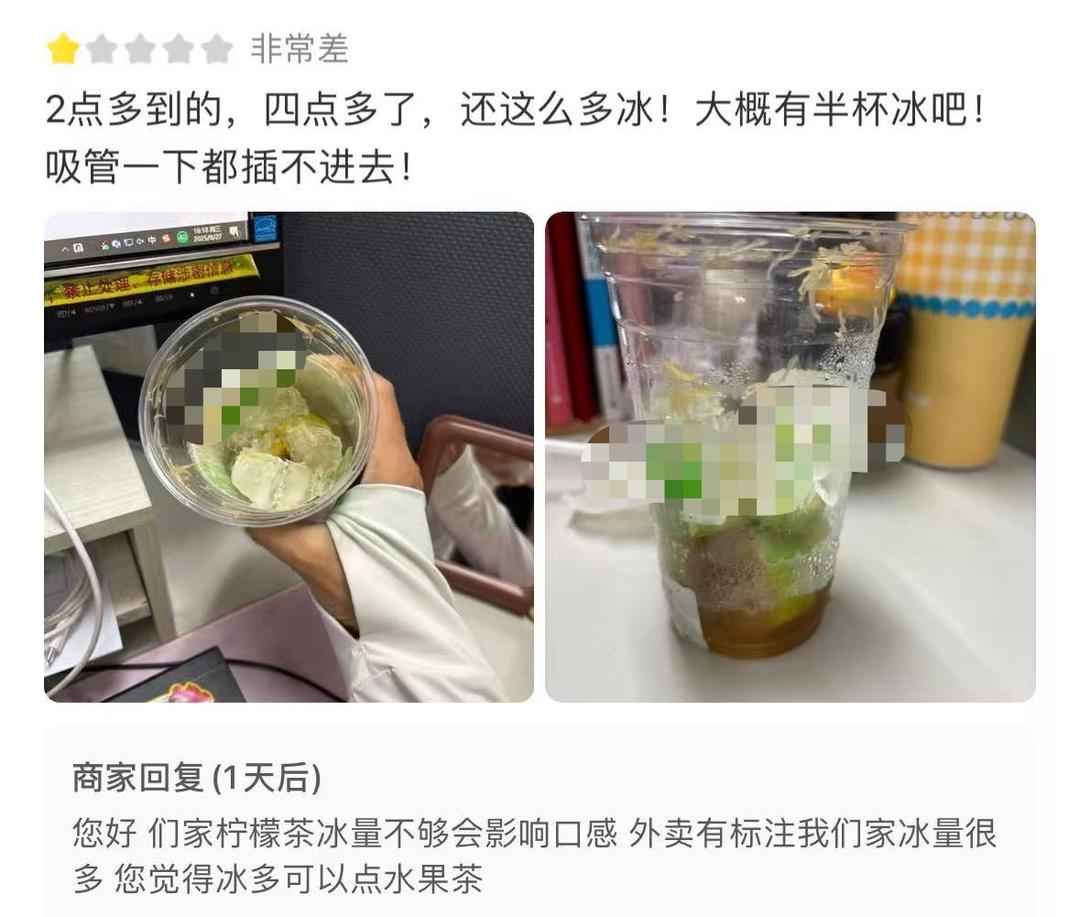 类似的困扰并非个例。有消费者表示,曾遇到过饮品喝了两个多小时,杯中的冰仍未明显融化的情况。“冰块这么扎实,都不化,占着容量的体积,感觉有点儿吃亏。”消费者孙先生则向记者表示:“有些饮品标注‘不推荐去冰’,去冰后就不满杯,这太不合理了,哪怕兑点茶或者水补满也行啊。”在他看来,商家完全可以通过简单调整兼顾消费者需求。