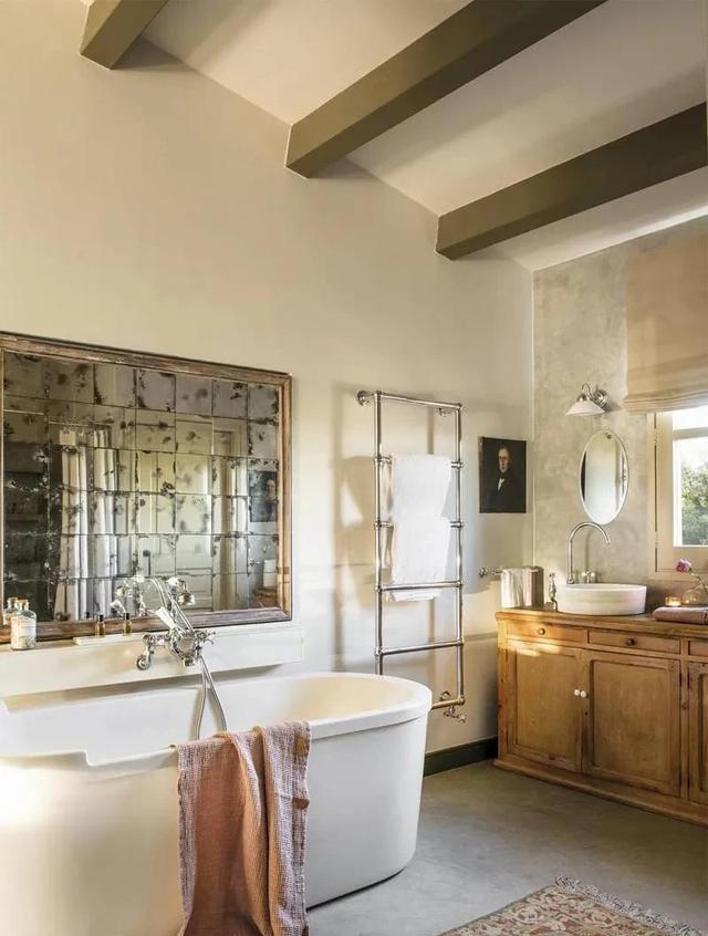 卧室之间没有墙壁、门和障碍物,能看到更衣室和浴室。那张美丽的老镜子,安装在古老的木制框架里。