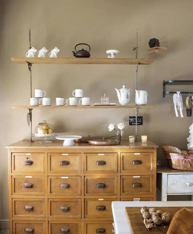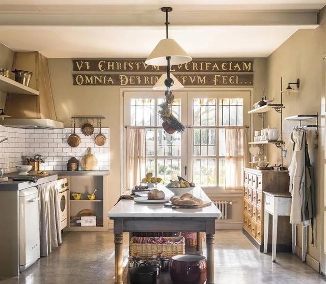 厨房里,一个老式岛台和一个古董抽屉柜,帮助女主人实现了质朴的乡村外观。