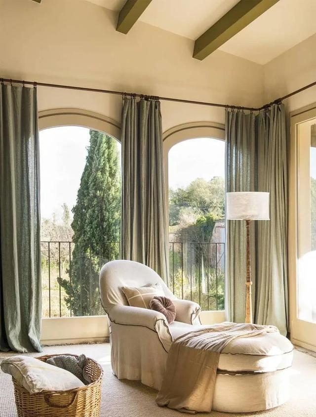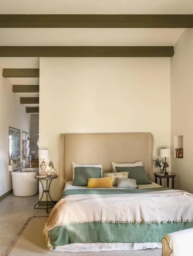 卧室里,使用了绿色系,加泰罗尼亚拱顶的木梁被涂成了深绿色。