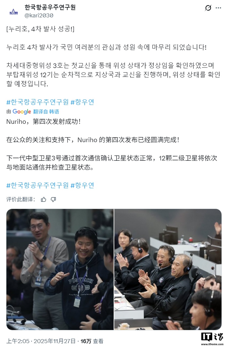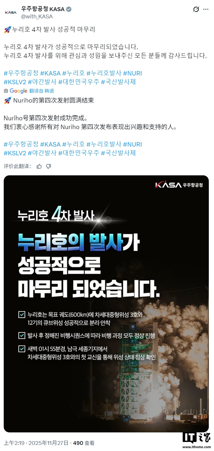 IT之家 11 月 27 日消息,韩国宇宙航空管理局(KASA)今日宣布,当地时间 27 日 1 时 13 分(北京时间 27 日 0 时 13 分),韩国自主研制的运载火箭“世界”号第四次发射取得成功,火箭搭载的新一代中型卫星 3 号进入预定轨道,实现既定发射目标。