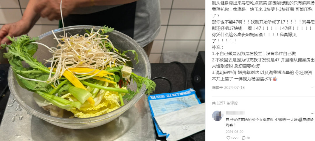 杨国福豆芽贵过山姆其实早已不值得大惊小怪,消费者早就算过这笔账,一份娃娃菜动辄10来块,一份毛肚30元,半份土豆7块,在一些品牌店很常见。