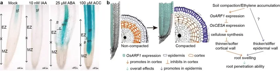 研究团队从上千个水稻基因中找到了关键调控因子OsARF1。当根系遇到板结土壤时,土壤中积累的气体激素乙烯会激活OsARF1,使其从根系中心扩散到皮层细胞,抑制纤维素合成酶基因的表达,最终导致皮层细胞壁变薄变软,根系得以径向膨胀变粗。研究团队通过进一步实验验证发现,缺失OsARF1的突变体根系纤细、无法膨胀;而过量表达OsARF1的植株根系粗壮、穿透力强。因此,乙烯-OsARF1-纤维素合成酶这条调控链路,正是植物应对土壤板结的关键策略。