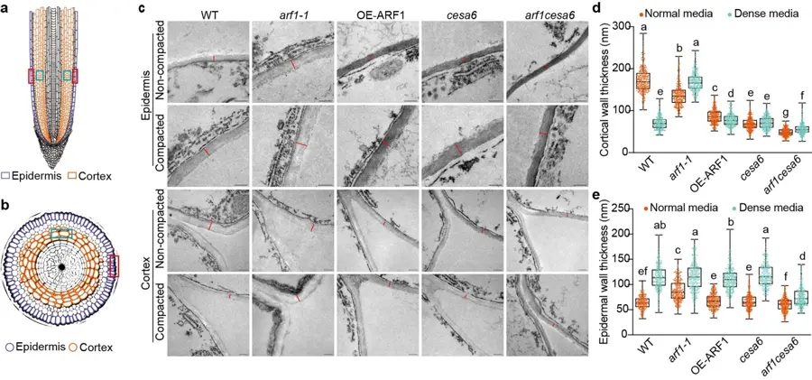 研究不仅破解了植物适应逆境的分子密码,更为未来作物设计开辟了新维度。基于“厚表皮—薄皮层”模型,育种家可以像工程师设计建筑那样,精准调控不同细胞层的细胞壁特性,培育出具有最优土壤穿透能力的根系,从而缓解农业机械化带来的土壤板结对作物生长的不利影响,更好地应对气候变化导致的土壤退化挑战。同时也可以扩大板结土壤的利用率,维护作物产量安全。