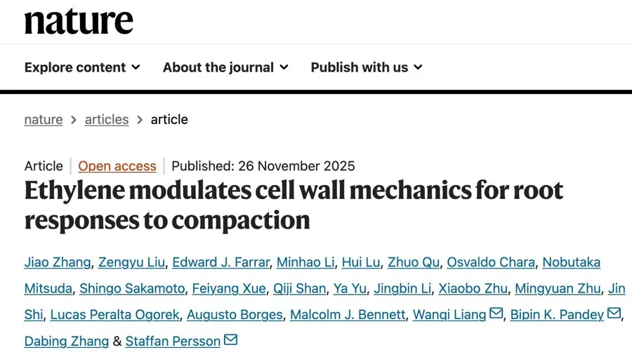 近日,上海交通大学生命科学技术学院张大兵和梁婉琪教授团队联合丹麦哥本哈根大学斯塔凡·佩尔松(Staffan Persson)教授团队、英国诺丁汉大学马尔科姆·J·本内特教授(Malcolm J. Bennett)团队在国际顶尖学术期刊《自然》上发表题为《乙烯通过调控细胞壁力学特性介导根系响应土壤板结》(Ethylene modulates cell wall mechanics for root responses to compaction)的最新研究,首次揭示了植物根系如何利用工程学原理适应板结土壤:通过主动响应积累的乙烯,精细调控细胞壁厚度,从而促进根系增粗,提高穿透能力以适应土壤板结。