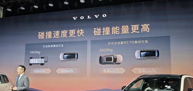 1959年,沃尔沃发明三点式安全带技术并开放设计专利,而在研发过程中,沃尔沃也通过更高的测试标准提升车辆的安全性能,以正面50%偏置碰撞测试为例,行业标准是用时速50公里对撞1.4吨的壁障车,XC70用时速64公里,对撞2.6吨的XC90,碰撞能量相当于标准测试3倍。