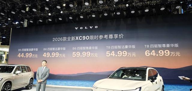 在车展上,沃尔沃还为大家带来了前不久上市的2026款XC90,新车提供燃油版、插电式混动T8总共5款车型,限时参考尊享价44.99-64.99万元。