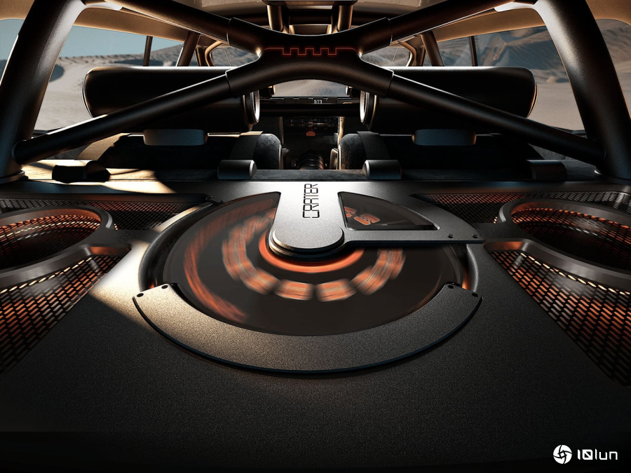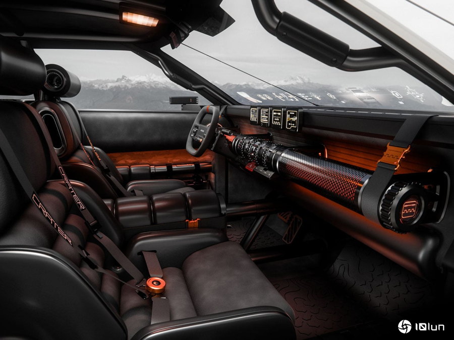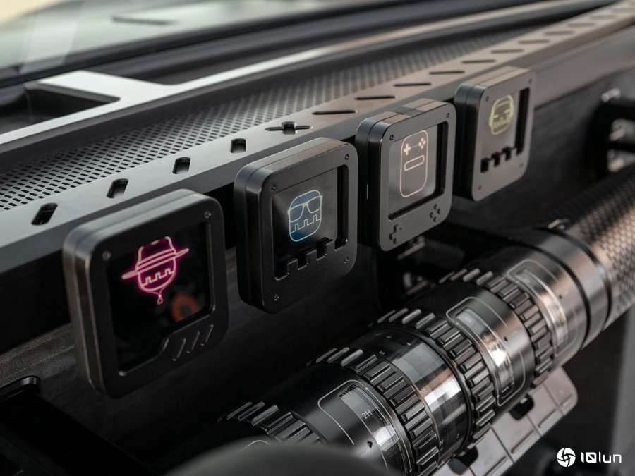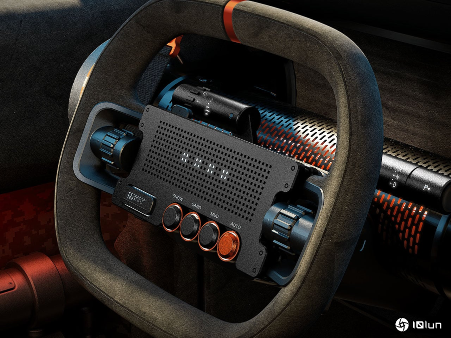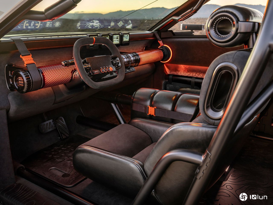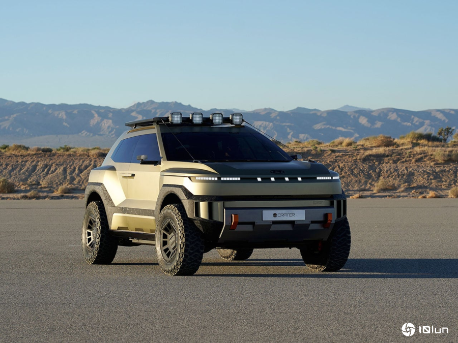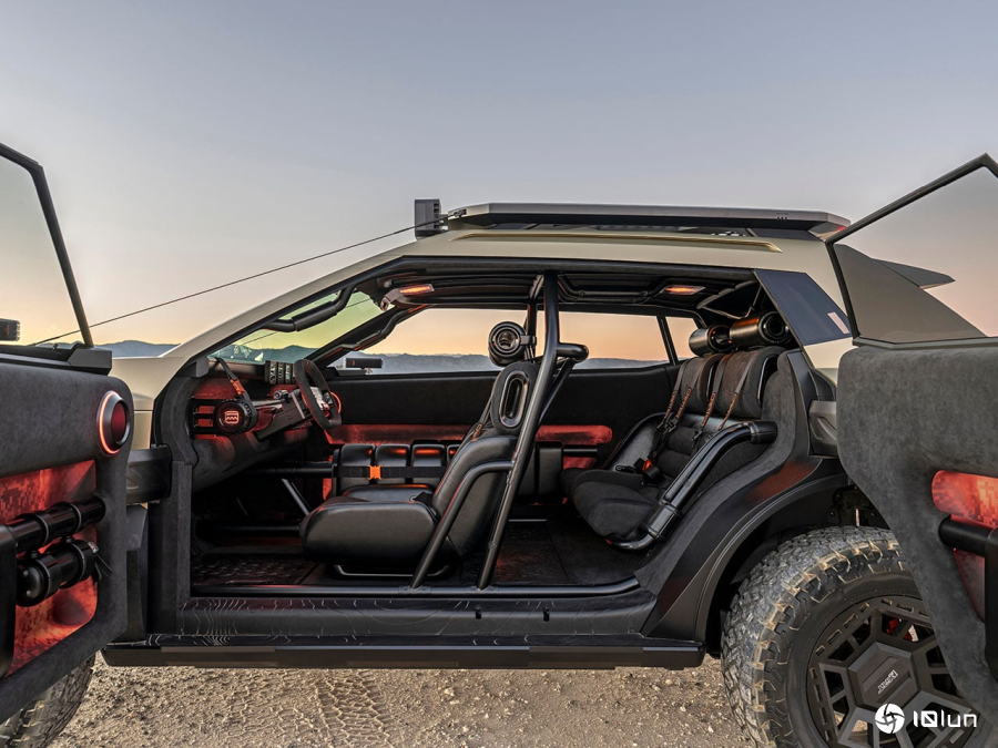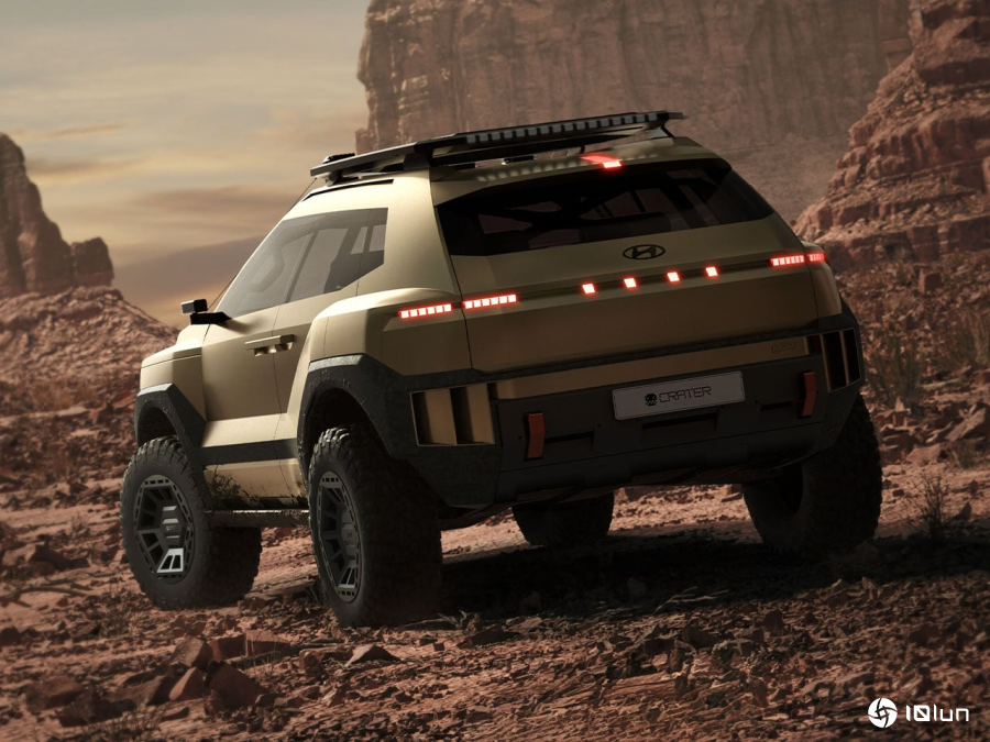 内饰方面,坚固的驾驶舱采用沙漠日落与篝火氛围灯光主题。方向盘配有实体按键,可切换雪地、沙地、泥地、自动和XRT等驾驶模式。仪表台内置可拆卸蓝牙音箱、灭火器和急救箱,以提升功能性。挡风玻璃下方的HUD显示当前功率、车速、下坡控制、罗盘和海拔计。车内外灯光采用像素化设计,呼应现代在INSTEROID EV等前作中展示的风格。车内还隐藏了克雷特人(Crater Man)吉祥物彩蛋,分布在车身多个隐蔽位置,供车主探索发现。