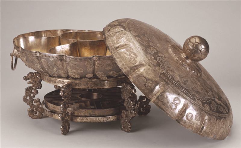 清朝宫廷的火锅材质以铜为主,因为铜导热性好,另有珐琅、锡、银等材质。其中掐丝珐琅火锅,以铜胎为基体,表面施以珐琅釉料,兼顾实用与美观。