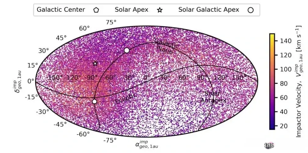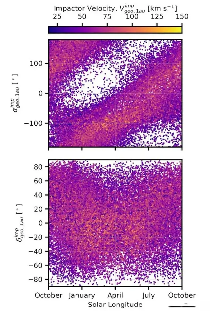 模拟结果出人意料地简单明了,大部分潜在撞击物都来自两个主要方向。一个是太阳在银河系中运行的前方,也就是太阳顶点。可以这样理解,因为太阳系朝这个方向移动,所以来自那里的天体自然会更多,就像雨点打在行驶的汽车挡风玻璃上,总是迎风面先湿。