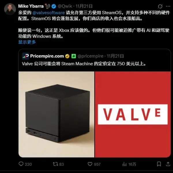 前Xbox高管、暴雪前总裁迈克·伊巴拉近日在社交平台上建议Valve向第三方硬件厂商开放SteamOS操作系统。他认为,开放授权不仅可以提升系统性能,还能借助更广泛的用户基础为Valve创造额外收入。伊巴拉指出:“这正是Xbox应该采取的策略……如果微软能够在硬件上拥抱SteamOS,将可能获得巨大成功。”